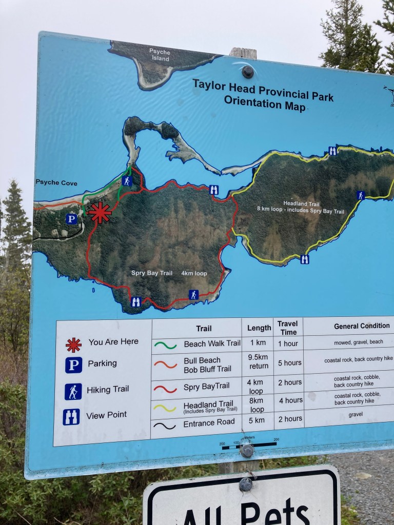 We arrived at Taylors Head at about noon…. it was early June. It was warm, about 19/20c. We packed a few snacks and some water. The sun was shinning and the beach looked so beautiful. I could not wait to get started on this hike. The trail head is at the farthest end of the beach, excellent signage to get you started. I almost did not want to leave the beach it was so nice. We were all frisky, being early June and at the end of long winter. A warm day in June on the beach is a small tease to what is to come in July. Little did we know.. lol