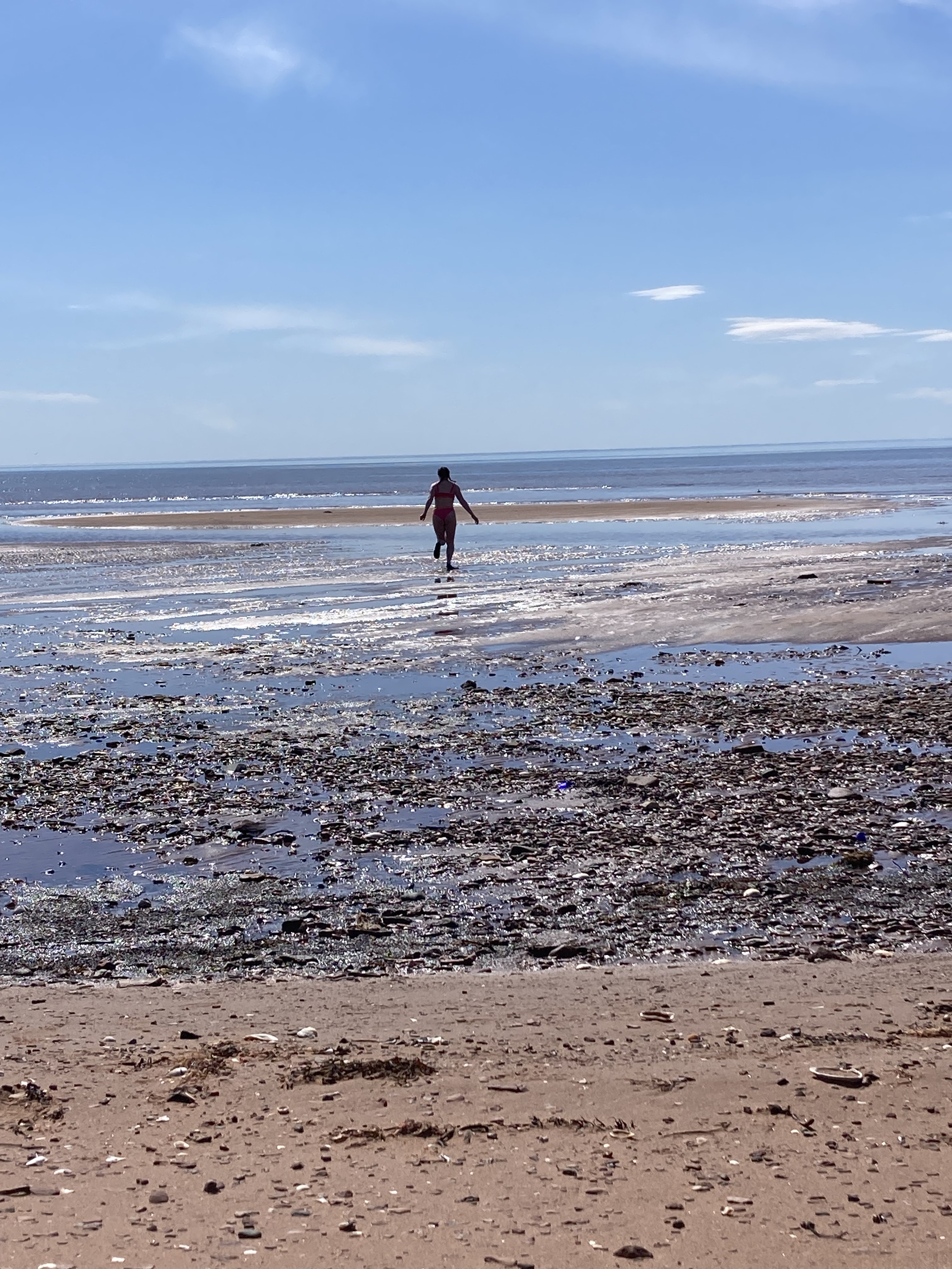 My daughter, who has been living in the Rocky mountains and the west coast of Canada for the last year, flew home for a 2 week visit. How lucky we were that it was during this exciting time. Being a true Maritimer, she decided to take a little plunge. She wore some water shoes just be extra careful not to get any glass in her feet. It’s still April… the air is warm, but the water was sharpe. At one time I would have made the brave dip, but on this day I was feeling the chill in the air.